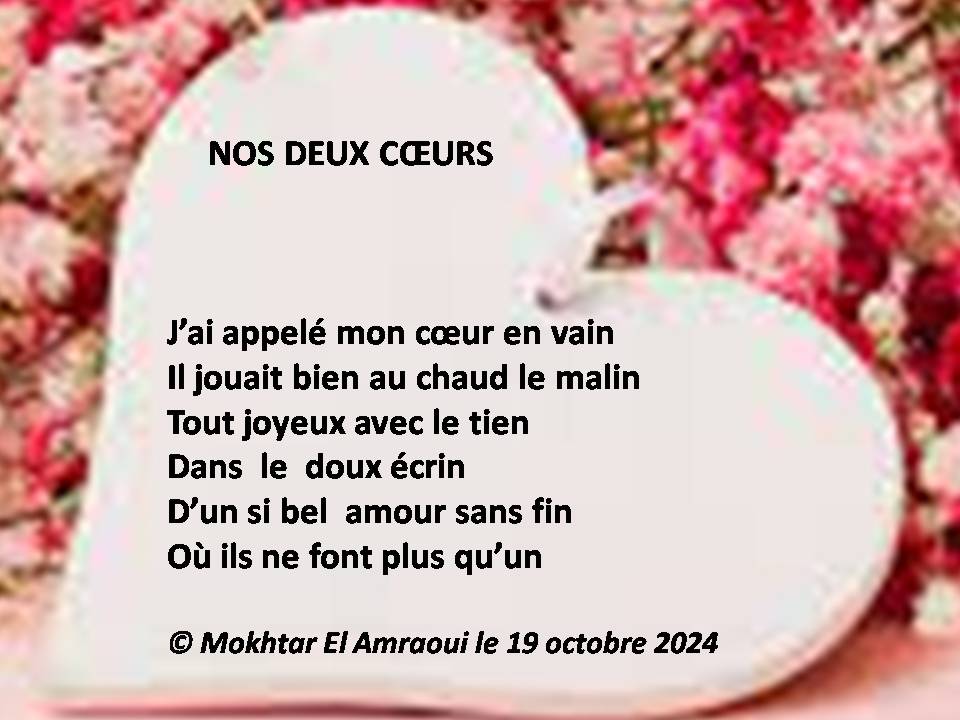 28 octobre 2024 afropoesie « NOS DEUX COEURS » de Mokhtar El Amraoui Poème et illustration de Mokhtar El Amraoui (1955-) – Partenaire d’AFROpoésie – TUNISIE Partager : Partager sur X(ouvre dans une nouvelle fenêtre) X Partager sur Facebook(ouvre dans une nouvelle fenêtre) Facebook J’aime chargement… Similaire